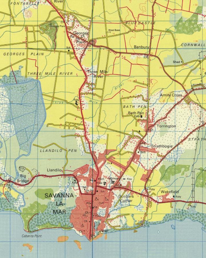 At the seaward end, beyond the Customs House and market Great George Street terminates at the walls of the OLD FORT. On the land side, the wall of great masonry blocks is intact, but on passing through the gateway the interior is found to be filled with sea-water, forming a basin used by town residents for an early morning or late afternoon swim. Basically this state of affairs seems to be more and more two hundred years old for when Admiral Knowles inspected Savanna-la-mar in 1755, he pronounced it to be "in my opinion is the worst port in the island very shoal water defended only on reefs, but the inhabitants thought proper to lay out $16,100 upon a fort never finished, and a third of it at least is fallen down into sea.